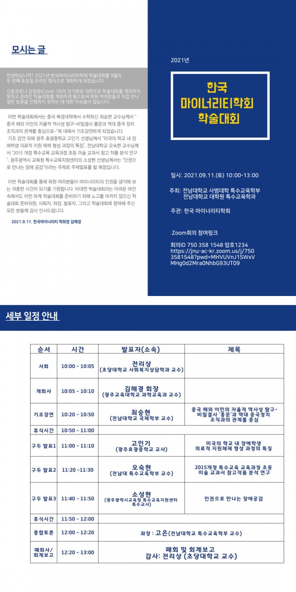 한국마이너리티학회 Zoom 학술대회에서 회원 여러분을 초대합니다.